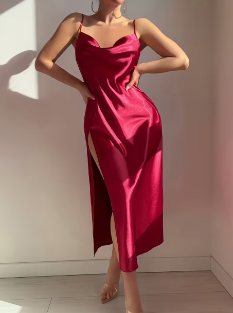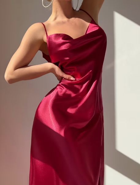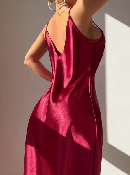 فستان نوم ماكسي بدون حمالات بفتحة رقبة على شكل حرف V للنساء باللون العنابي